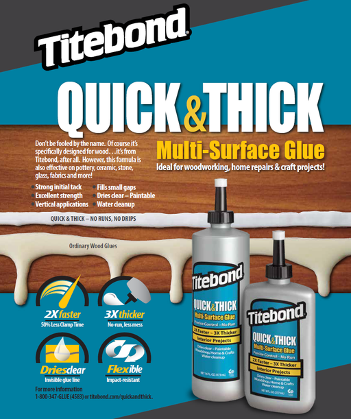 TitebondHecho en EE.UU. Titebond Quick & Thick Multi-Surface Glue es el pegamento a base de agua más espeso y de secado más rápido disponible para us...